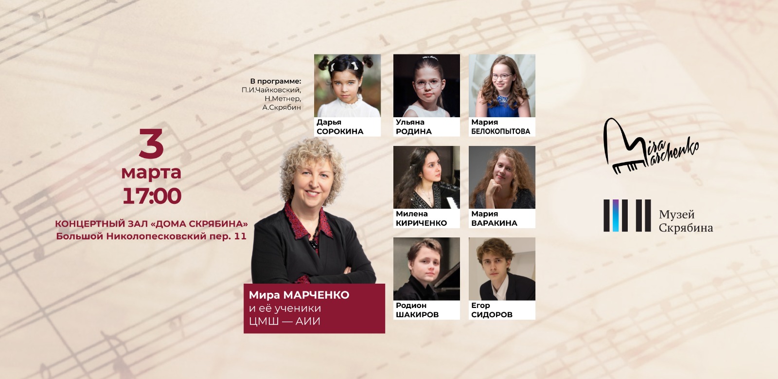 Для вас прозвучат произведения русских композиторов. Фортепианные циклы «Детский альбом» и «Времена года» П.И. Чайковского вы услышите в исполнении талантливых пианистов, учеников Центральной музыкальной школы Академии исполнительского искусства класса М.А.Марченко. Егор Сидоров, будущий выпускник ЦМШ-АИИ исполнит «Сонату -Сказку» соч. 25 №1 Н. Метнера. Подарком для слушателя будет выступление «наследницы» традиций великой русской фортепианной школы Миры Марченко. Произведения П.И.Чайковского и А.Скрябина прозвучат в исполнении Мастера.